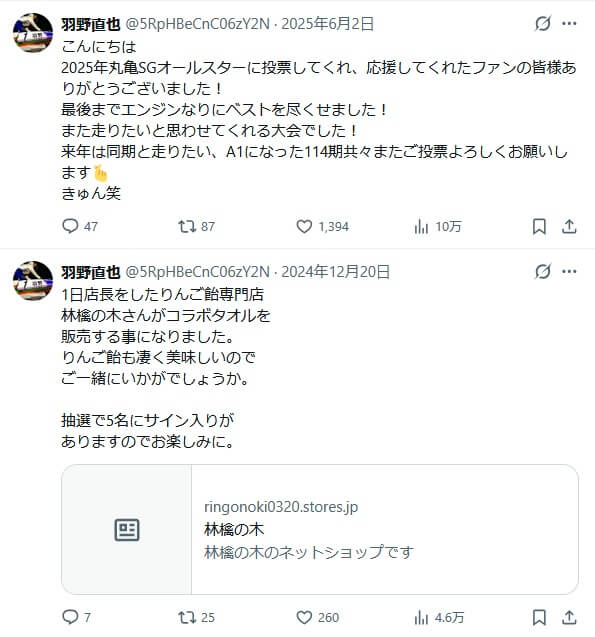 2026年1月現在の直近投稿は、2025年6月にポストしたSGボートレースオールスター2025の応援感謝で、じつに半年以上ポストをしていません。