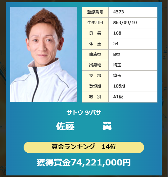 佐藤翼は、埼玉県さいたま市出身の105期レーサーで、現在もA1級のトップレーサーとして活躍中です。