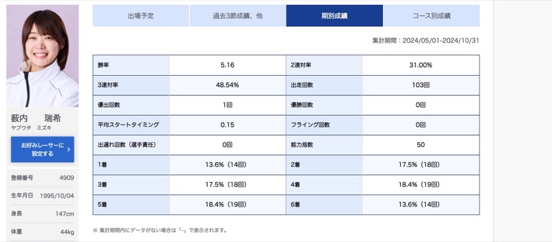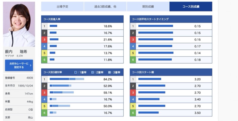 4コース・6コースの成績はイマイチだけど、そのほかのコースでは舟券に絡みそうだね〜!