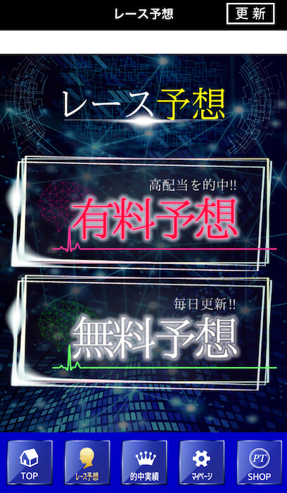 アプリトップページには、なぜか「無料予想」が2つあったり、プラン一覧が載せられています。