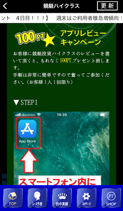 「競艇投資ハイクラス」はアプリダウンロード後にメールアドレスを登録すると、100PT(1,000円分)がもらえるようです。