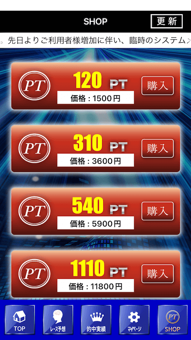 しかし、実際に購入しようとすると120PTの購入に1500円がかかります。(1PT=12.5円)