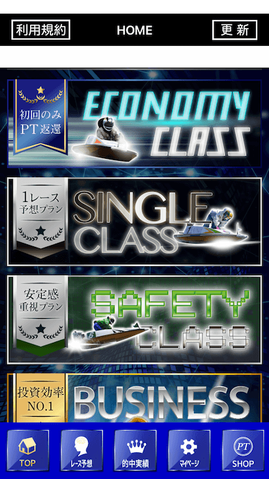 アプリ内は以下の5つの要素に分かれており、競艇予想サイトの会員ページと似たような作りです。