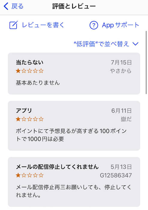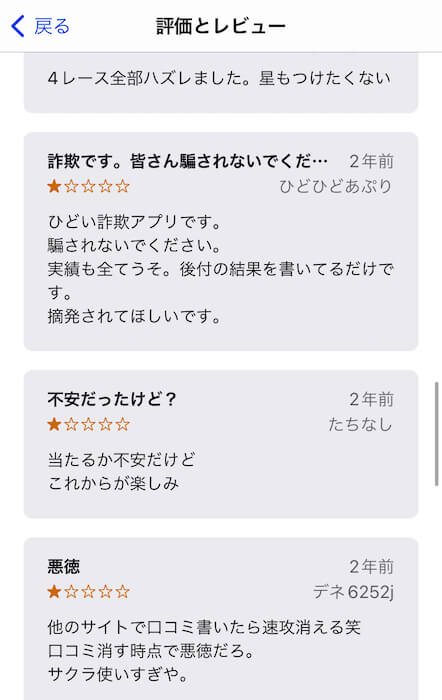 低評価の口コミでは、「サクラである」「的中実績は後付けしている」「詐欺アプリである」などの声が目立ちました。