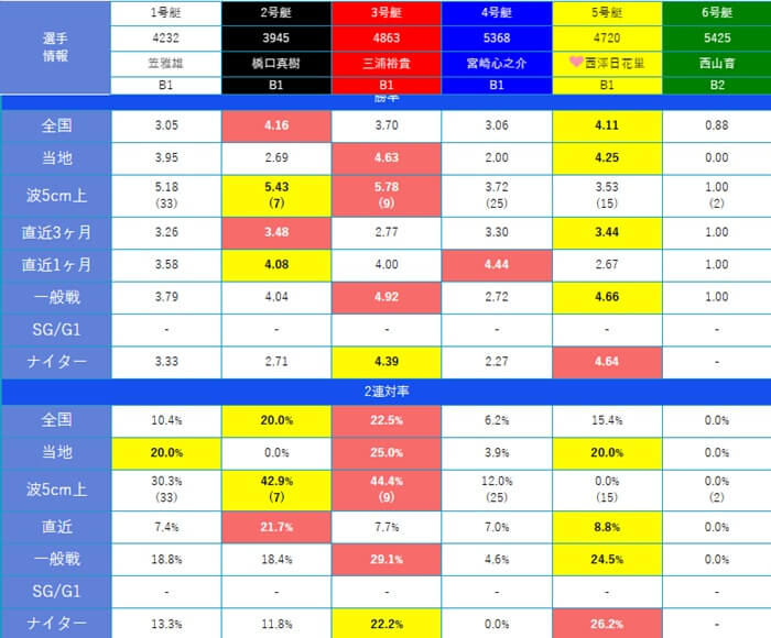 基本情報・・・つまり選手の総合的な成績でいうと、3号艇の三浦裕貴がトップの成績で、以下2号艇の橋口真樹、5号艇の西澤日花里の成績が良いですね。