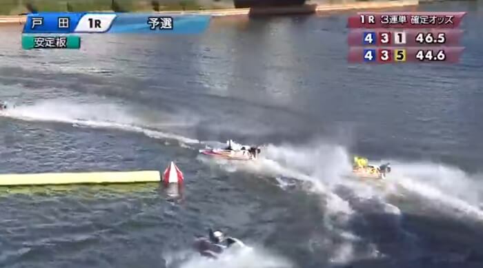 通常センターがまくりを成功させるとイン艇が崩れがちなのですが、4号艇の宮崎が完璧なスタートを決めたのでイン艇もそれほど崩れず、6号艇を除く4艇はもつれこむように追いすがります。