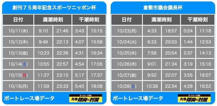 どちらにせよ、影響の大きい競艇場で予想をするときは、競艇場の公式サイトにある潮汐表(潮の満ち引き時刻が記載された表)をチェックしましょう!