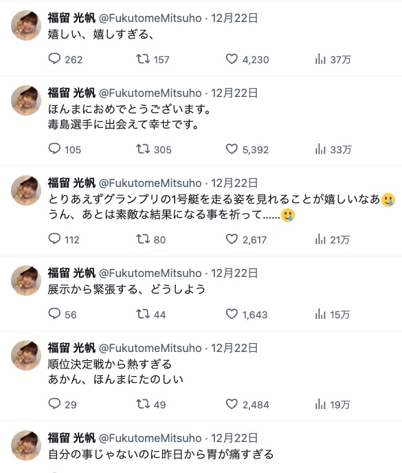 グランプリでは毒島誠が優勝戦1号艇だったのだが、福留光帆はXでその様子を実況?していたな。
