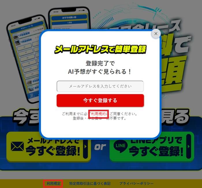 とりあえずメールアドレスとLINEで登録可能ということで、登録すべくクリックしてみると、そこには「ご利用までに必ず利用規約にご同意ください」の一文が。