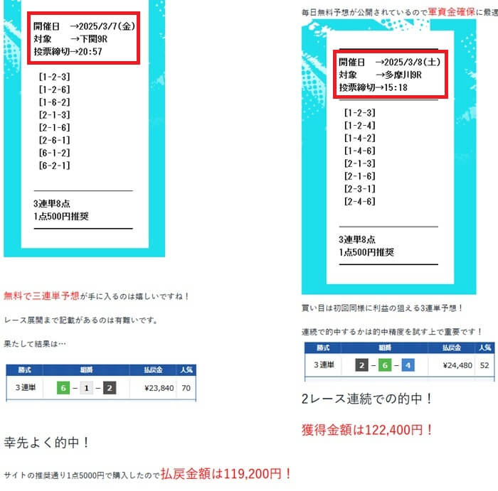 レビューを見ると2025年3月7日と3月8日の無料予想を検証しており、それぞれ下関9Rと多摩川9Rで2日連続万舟をゲットしたと報告してます。