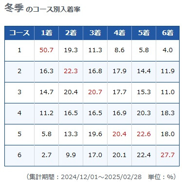 冬季は1コースの勝率が上がるといっても、50.7%では信用しきるのは難しいのう