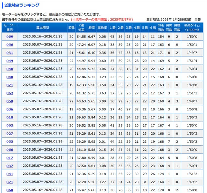 これは単純な2連対順じゃから、モーター抽選が終了してから改めてモーター評価を調べるのが良さそうじゃ