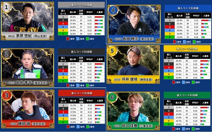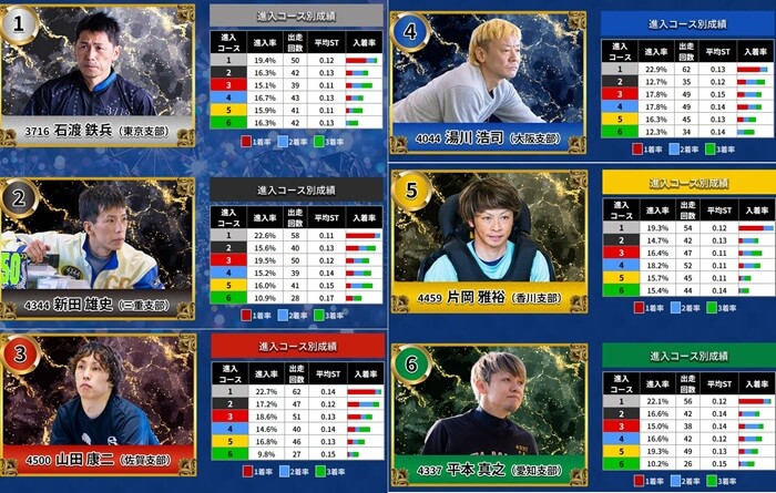 1号艇には江戸川をホームとする東京支部の石渡鉄兵が乗りますが、その他の選手に関しては他地区の選手となっています。