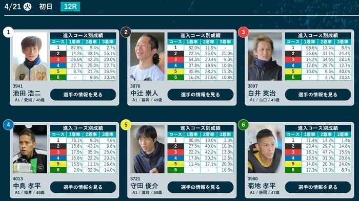どの選手も枠なりで進入すれば2着率が20%〜30%程度あるので、誰か1人に絞らずに広く買い目に入れるのが無難でしょう。
