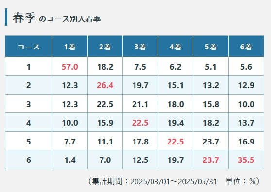 マスターズチャンピオンが開催される春季では1コースの1着率が57.0%と、他の季節と同じくらいにインの信頼度が高いことがわかります。