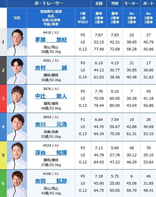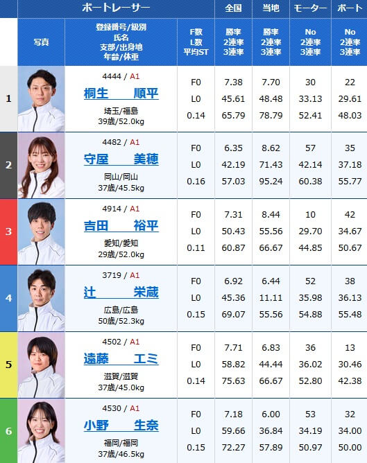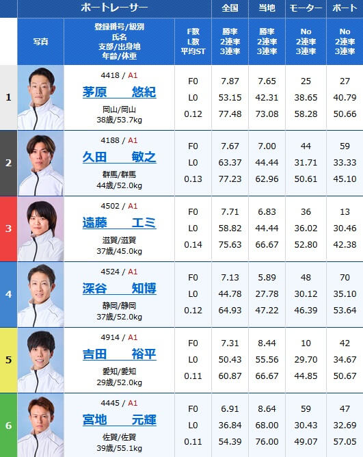 気になるのは初日5号艇から2着となった3号艇の遠藤エミ、そして当地勝率の高い5号艇の吉田裕平ですね。