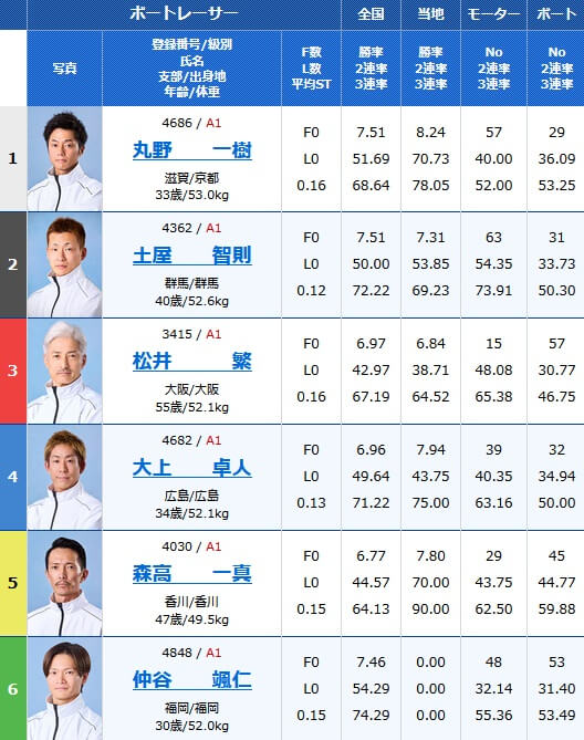 | 5号艇 | 丸野一樹 | 滋賀 | 52 |