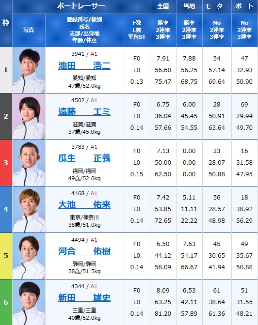 | 3号艇 | 池田浩二 | 愛知 | 59 |