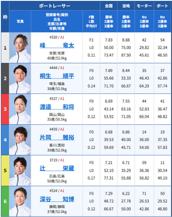 次に2着になりそうな選手ですが、モーターや当地成績を考えると2号艇の桐生順平か4号艇の片岡雅裕になる可能性が高そうです。