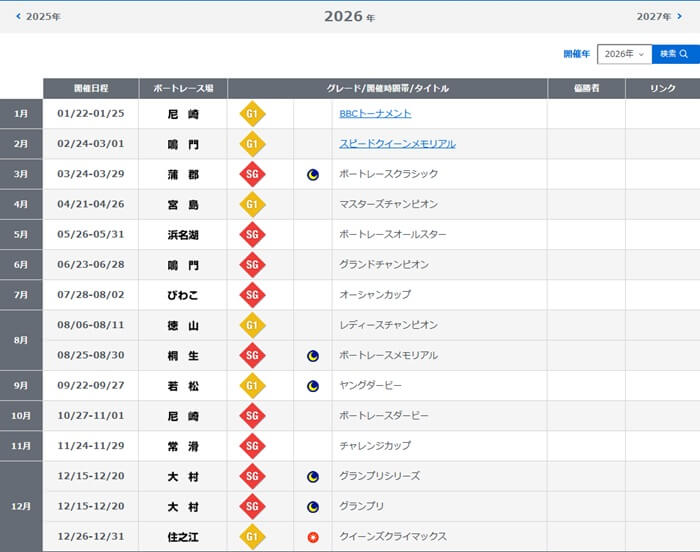 2026年のSG日程および開催場はコチラで、2025年のように年に2回開催するようなことにはなりませんでしたね。