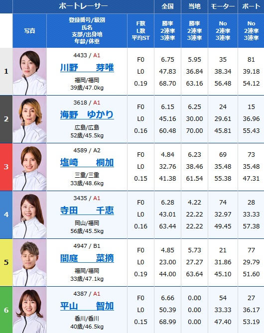 特に3号艇の塩崎桐加は当地勝率が高い選手なので、穴狙いの人は3号艇を軸に予想するのもアリ!