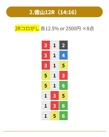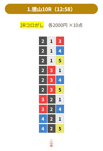 | 3月7日 | 宮島9R | 1-2-3/1-2-4/1-3-4/1-4-2/1-4-3/1-4-5/1-4-6/1-5-4 | 1-2-5 | ¥1,230 | +4,300円 |