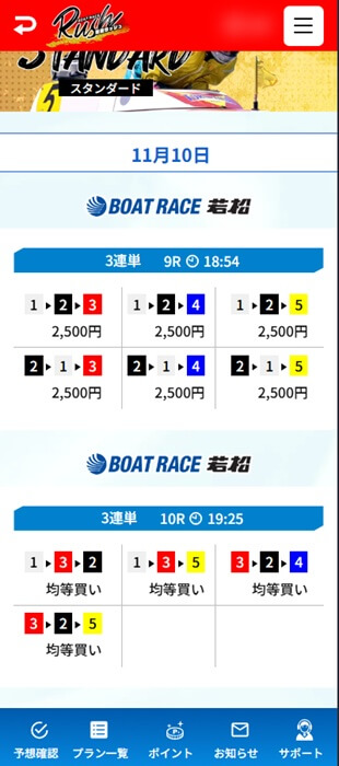 さて参加したスタンダードは2025年11月10日のナイター、若松9R→若松10Rの予想が届きました。