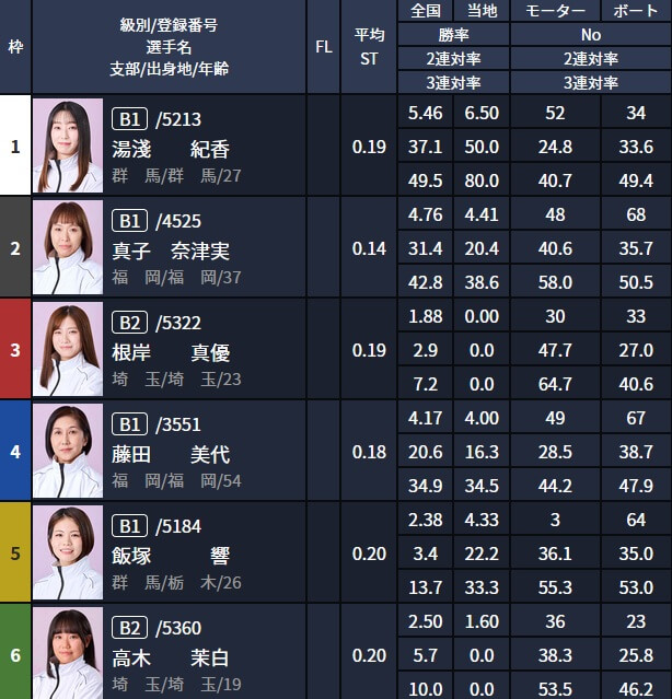 出走表を確認すると2号艇の真子奈津実は地元・福岡支部に所属し、モーター2連対率も高いことからイン有利な若松でも軸に採用されているのでしょう。