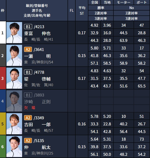 出走表を確認すると軸になっている1号艇の重富伸也はモーター性能も高いのですが、今節はアウトコースに進入しているのが気になるところ。