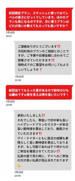 LINEで簡単に登録できるのが良いです。担当者とのやり取りもスムーズで、どのプランを選べばいいのか相談しやすいのが助かります。高配当狙いでも雰囲気が良く、初心者でも挑戦しやすいと思います。