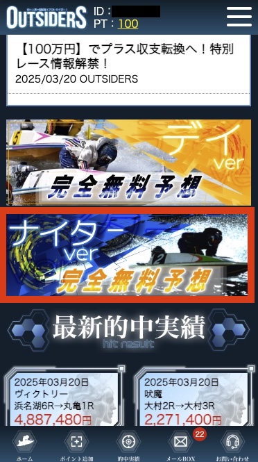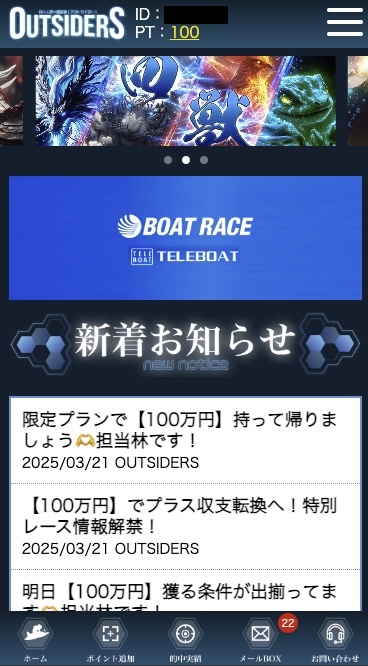 次は「競艇アウトサイダーズ」の会員ページを見ていこう。