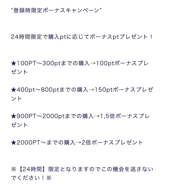 - 登録後24時間以内ボーナス特典