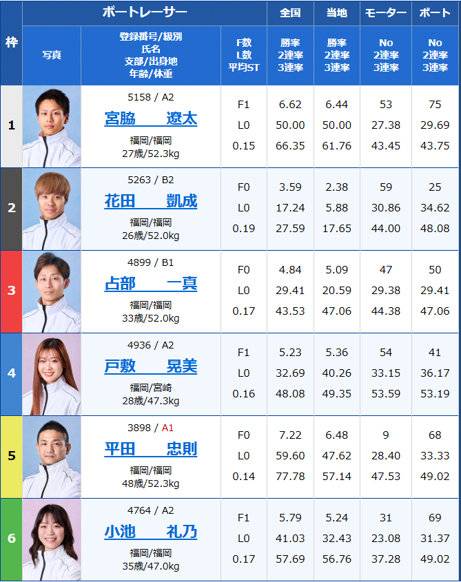 - 3号艇:待鳥雄紀(福岡・B1)