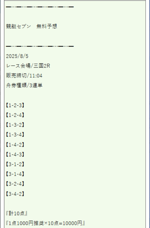 無料予想は、1日2回提供されていて、3連単10点もの買い目が出されています!