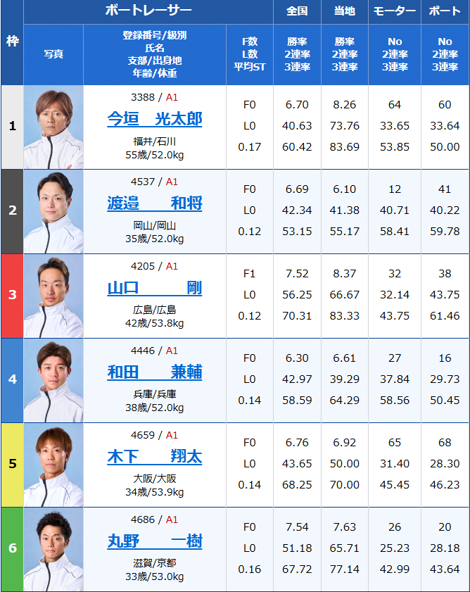 - 6号艇:丸野一樹(滋賀・A1)