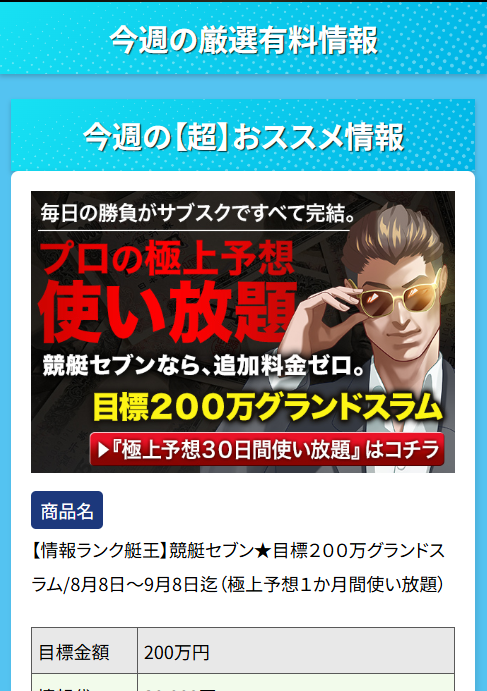 無料予想は3連単10点と買い目が多く、目標金額が設定されていないため計画的に使いにくい印象となっており、有料予想も目標金額が200万円と非常に高く、情報料も高額でリスクが大きい内容です。