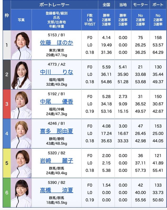- 1号艇:佐藤ほのか(B1・東京)