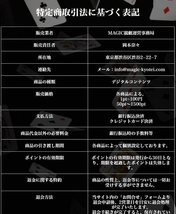 特商法に基づく表記には電話番号が不記載!予想師や情報源はサイト内には書かれず、予想の根拠では手品師の特性について語るのみという悪質ポイントばかりが積み重なっていきます。