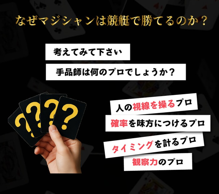 なぜマジシャンは競艇で勝てるのか?と書かれておるが、マジシャンが競艇がうまいとは初耳じゃの