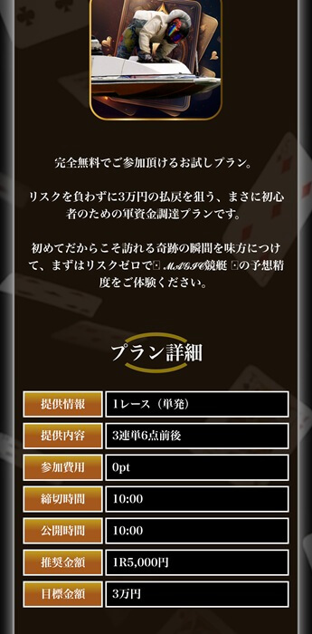 無料予想は1日に1回きりということで、予想の質を確かめるために実際に参加してみれば、レース選定も買い目も的外れすぎて予想が全く当たらないこともわかりました。