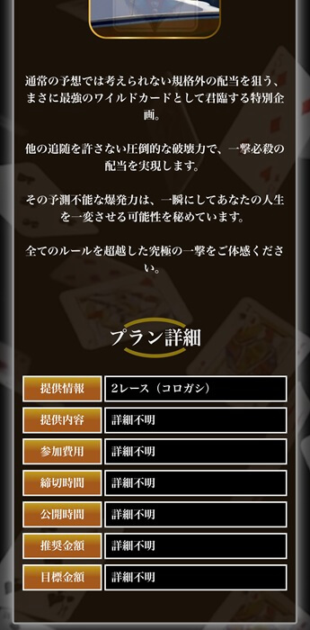「ジョーカーワイルド」のようにVIP専用の詳細不明なプランもありますし、登録特典で無料を含め9プランと言っていたのは過剰広告にしか思えませんね。