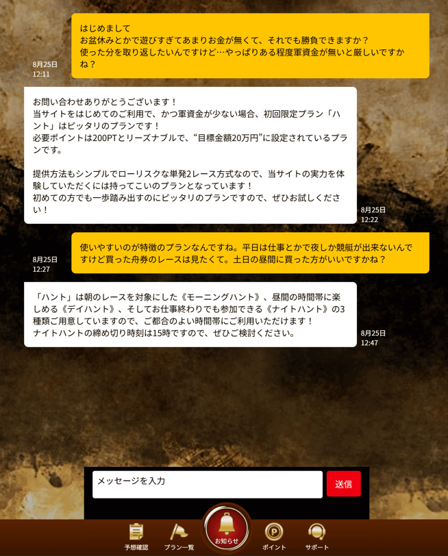 予想のことはもちろん、舟券の買い方や資金運用まで気軽に相談できるので、不安を抱えず安心して利用できますよ!