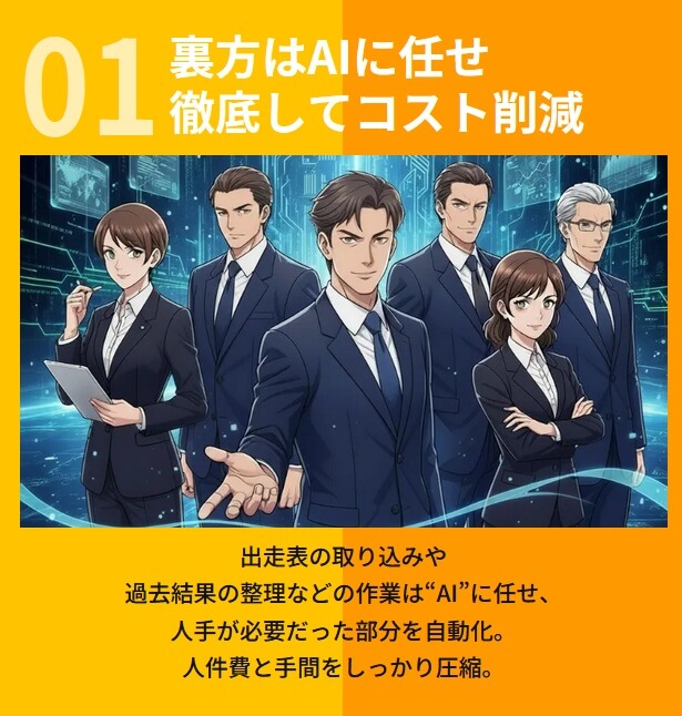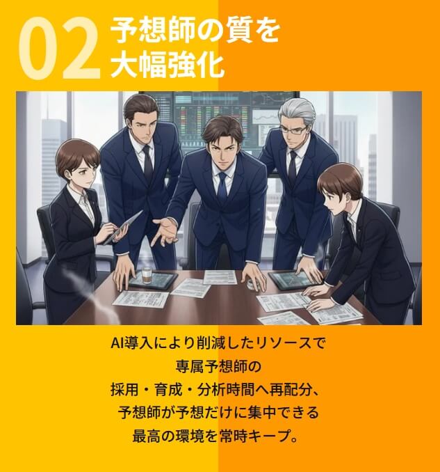 AI導入で削減したリソースで予想師の質を大幅強化、ということで採用・育成・分析と質の高い予想師を揃えているようです。