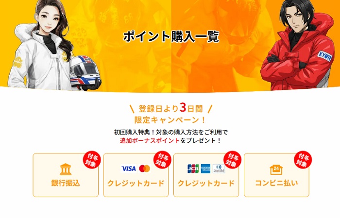 ポイント購入は銀行振込決済がお得!という話しをしましたが、なんと登録から3日間・初回限定でボーナスポイントがつくキャンペーンも開催しています。