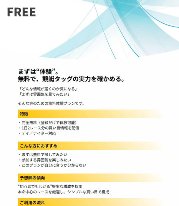 変にこだわってボートレースとはかかわりのない画像を使っているサイトも多いですが、このサイトではプランにレーサーの画像が使われていて一目で競艇予想サイトだと理解できるのもグッド。