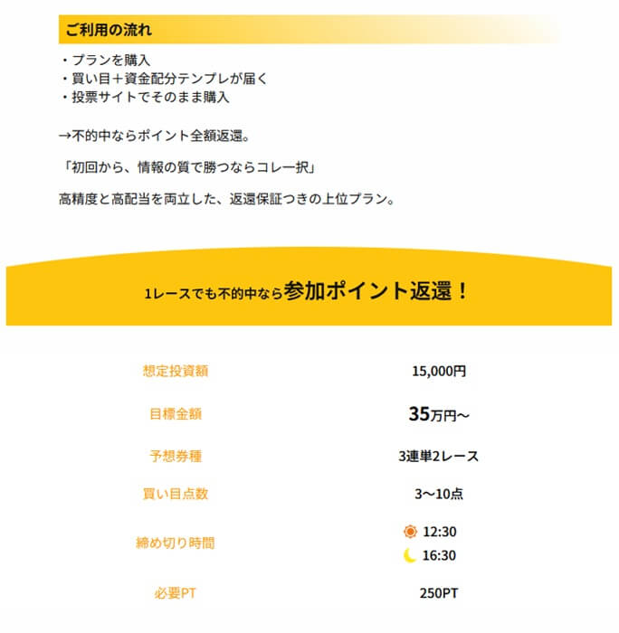 1レースでも不的中なら参加PT返還の補償が付く初回限定プランがおすすめ!他にもコスパの良いプランがそろっていますので、悩んだ際には担当に相談するのもいいでしょう。