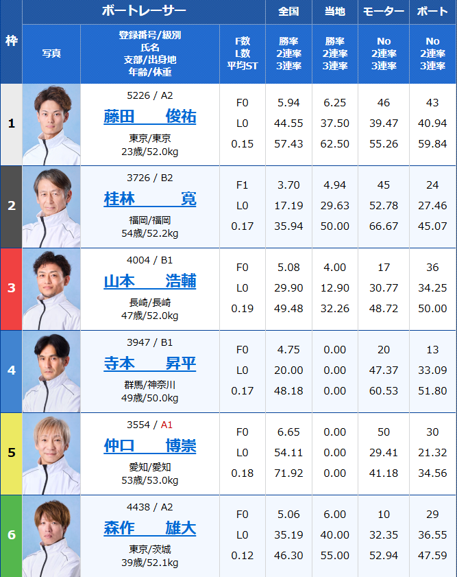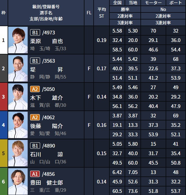 紐になっている2号艇の山田祐也・4号艇の坪井康晴もA1級でありながら、勝率も高いので順当といった印象ですね。