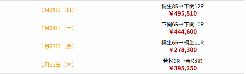 シングルを2回使って1勝1敗。勝った回の配当が大きく、結果的にはプラス収支でした。毎回当たるわけではないですが、当たった時の回収力が高く、使いどころを選べば十分戦える印象です。