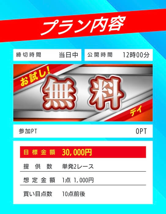 | プラン名 | 提供数 | 買い目点数 | 想定金額 | 目標金額 | 参加PT |