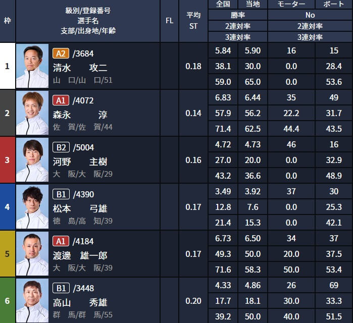 出走表を確認するとメインの軸になっている1・2・5号艇はA級なのですが、買い目のうち6点に入っている3号艇の河野主樹はB2級で期待薄。